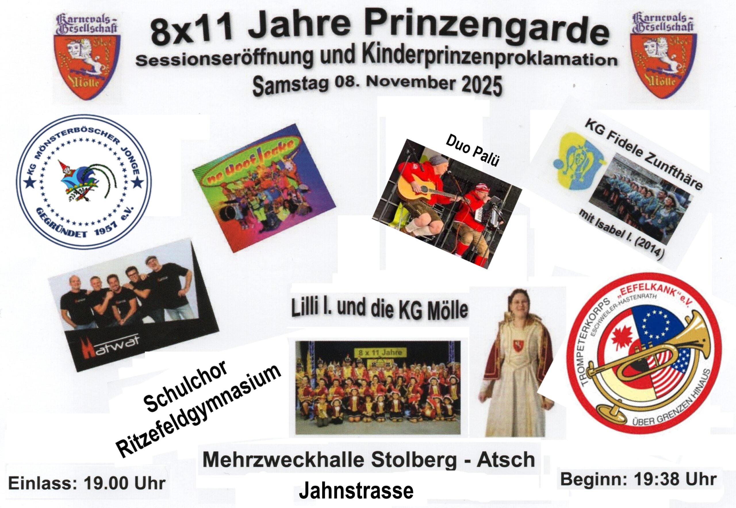 8×11 Jahre Prinzengarde Einlass: 19.00 Uhr Beginn: 19.38 Uhr Veranstaltungsort: Mehrzweckhalle Stolberg – Atsch Jahnstraße 1, 52222 Stolberg Nach langer „Durststrecke“, dafür aber passend zu unserem