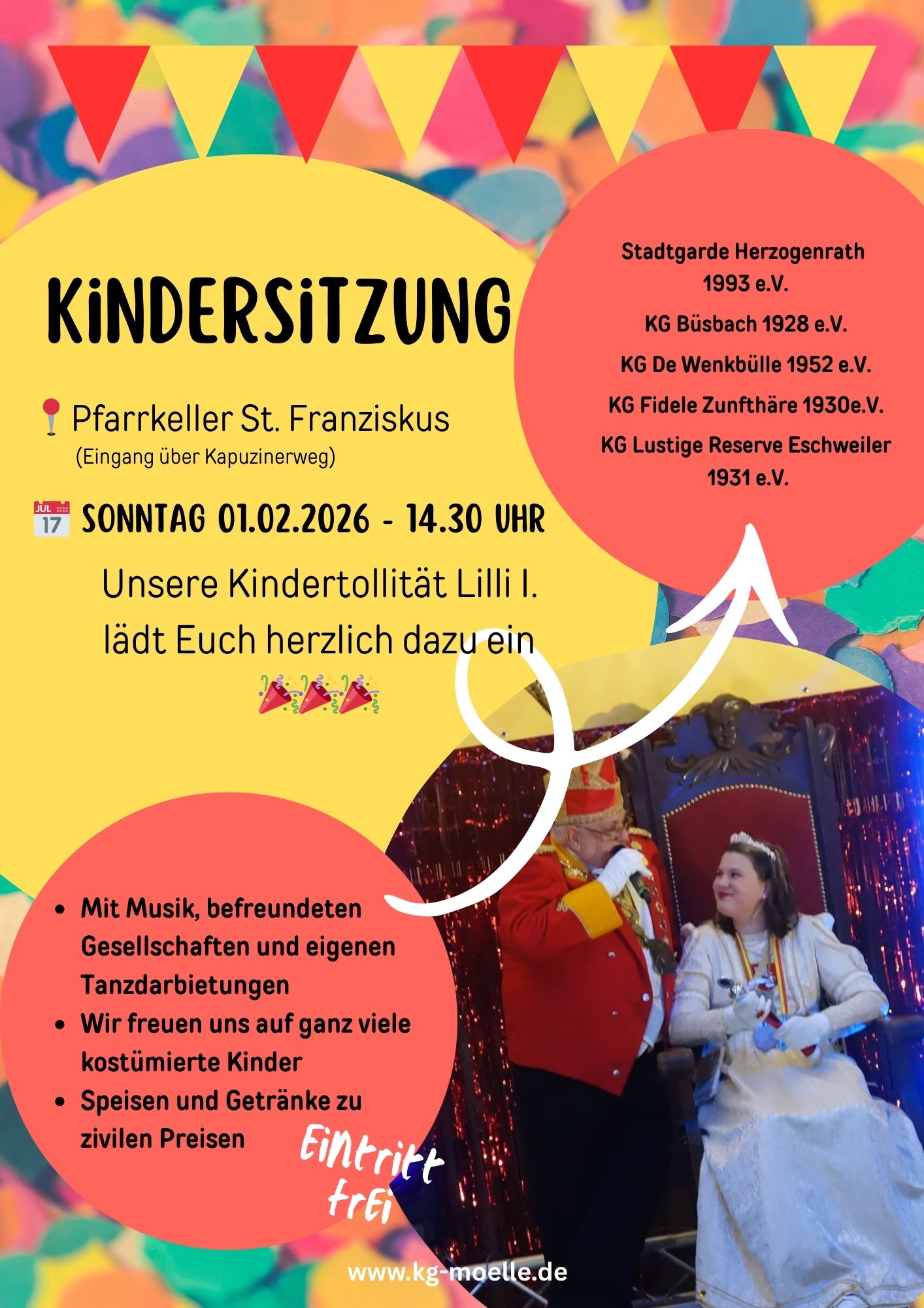 Begrüßt mit uns zusammen: KG Büsbach 1928 e.V.KG 1935 Vicht e.V.KG Mönsterböscher Jonge von 1957 e.V.KG Lustige AtschinesenFidele BessemskriemerKG Zweifaller Karneval 1950 e.V. KG De Wenkbülle